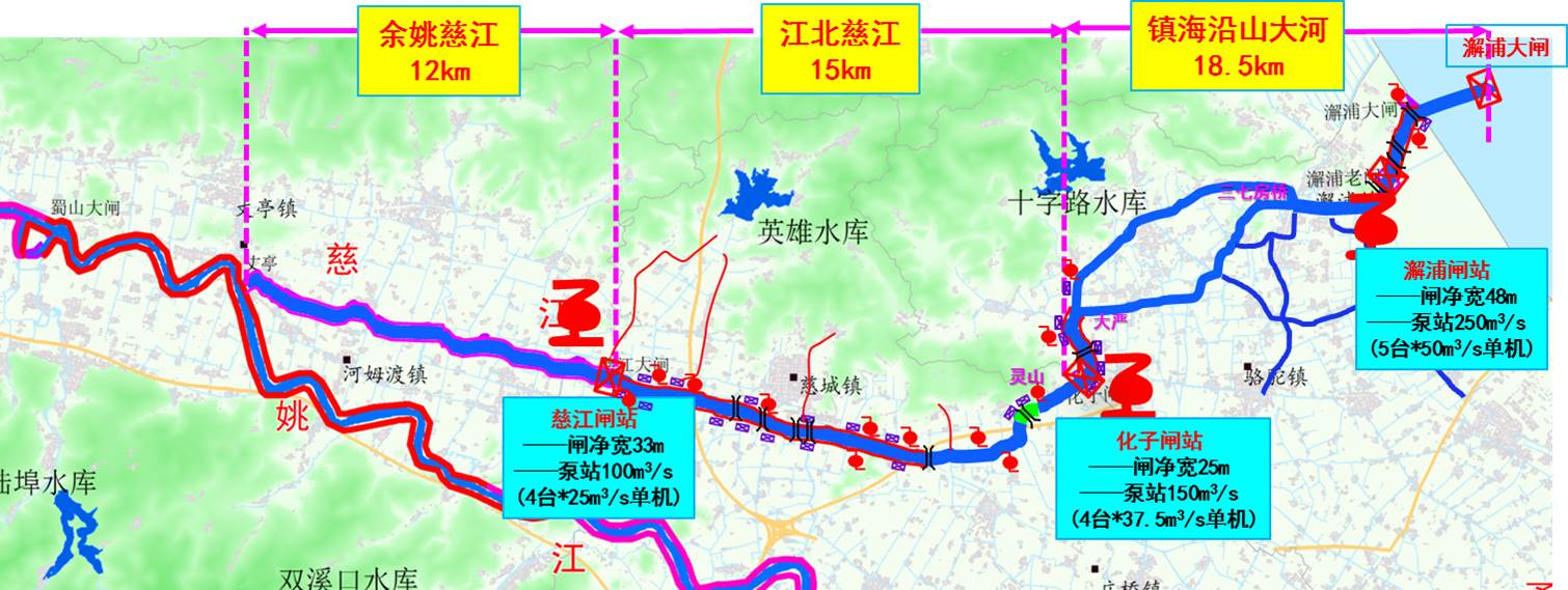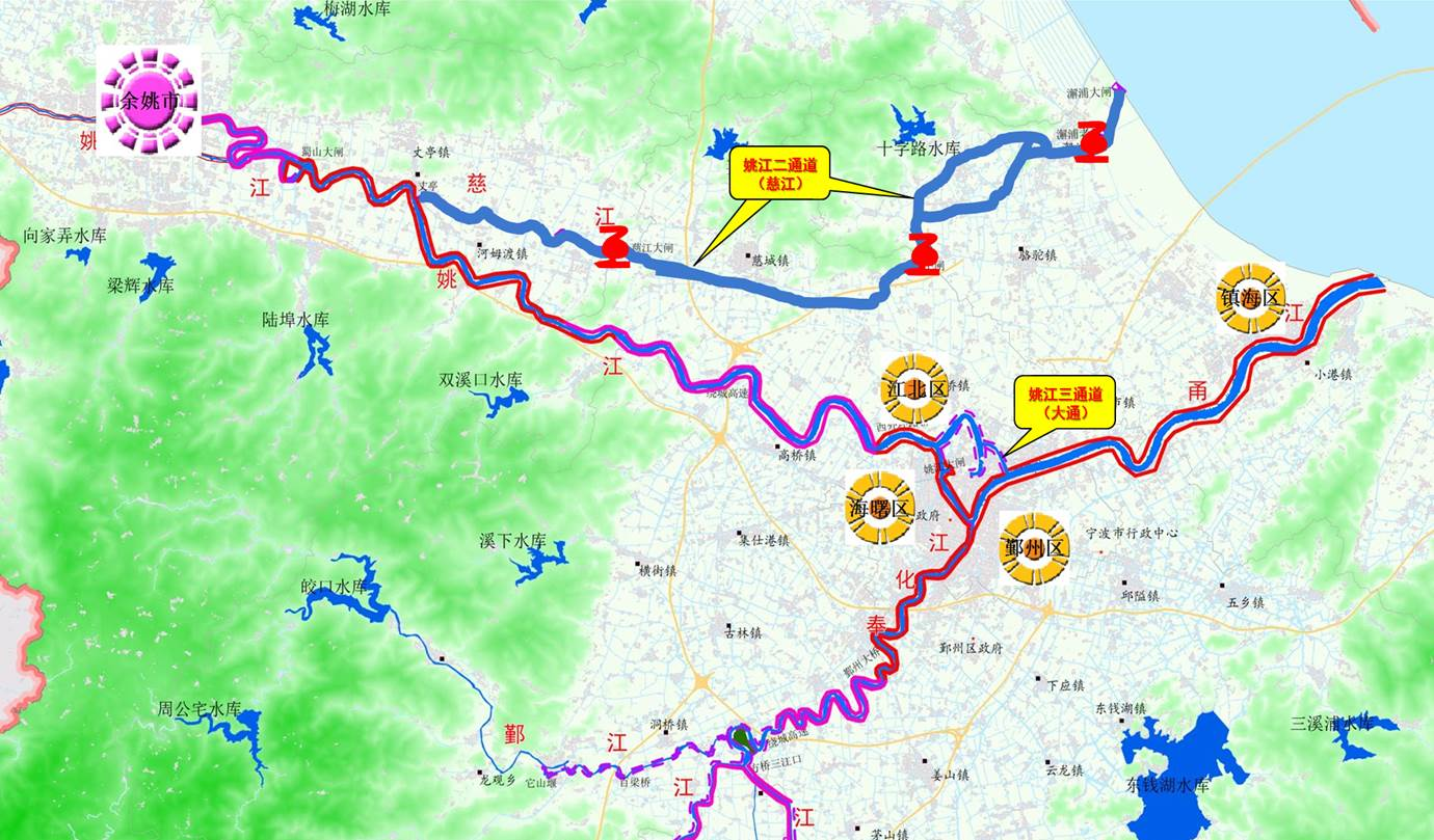 姚江東排工程(即姚江二通道(慈江)工程)西起慈江大閘,經(jīng)江北、鎮(zhèn)海沿山大河,自西向東由澥浦大閘外排入杭州灣,工程全長約34km,研究為有效克服土地、資金、工期等一系列要素制約問題,創(chuàng)新性引入“高速水路———梯級(jí)泵站排水”設(shè)計(jì)理念,切實(shí)解決了濱海平原地區(qū)自流排水易受外海潮位頂托和河道輸水流速低、排水慢等問題,該方案于2015年11月經(jīng)寧波市人民政府第70次常委會(huì)議審議通過,并納入省委省政府、市委市政府確定的姚江奉化江流域洪澇治理“6+1”工程。